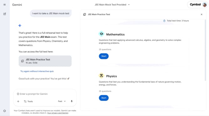 JEE Main prep with Gemini: Students can now take full-length mock tests directly in Gemini, with vetted content from partners like Physics Wallah.